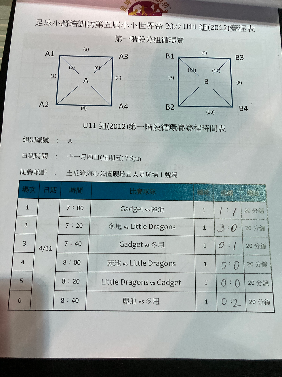 是次比賽有七支球隊參與,我哋與南區麗池、大埔Gadget、主要由元朗2012年班底組成的「冬甩」,我哋在有主力缺陣下,主要以防守反擊為打法,效果亦不算差,雖然防守穩健,但破門乏術,最終都打不開勝利之門。三場比賽中,首場0:3 不敵「冬甩」、次場0:0 和南區麗池、尾場同樣0:0 和大埔Gadget。三場小組賽後,我哋Little Dragons、南區麗池、大埔Gadget 同樣成績2和1負,但得失球我哋以-3 球墊底,無緣出線。